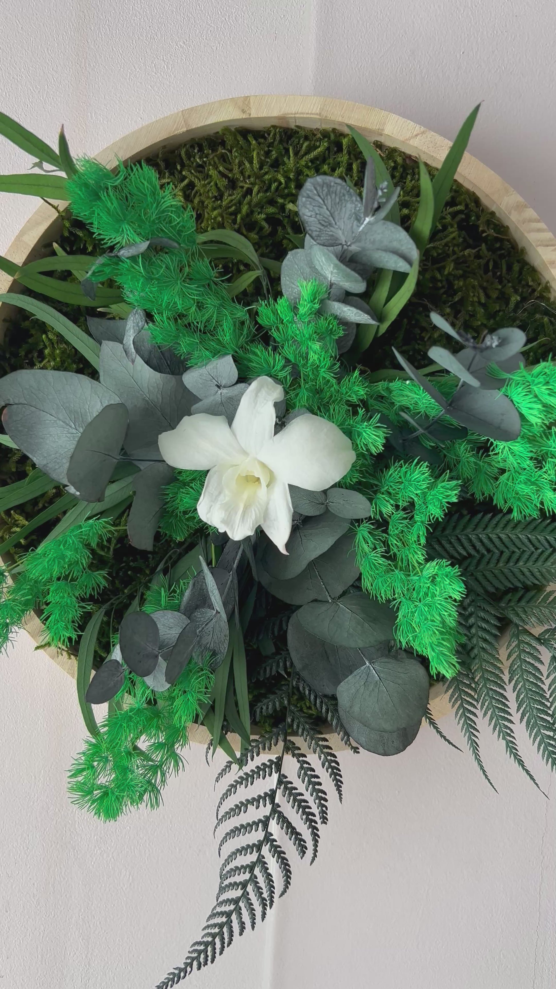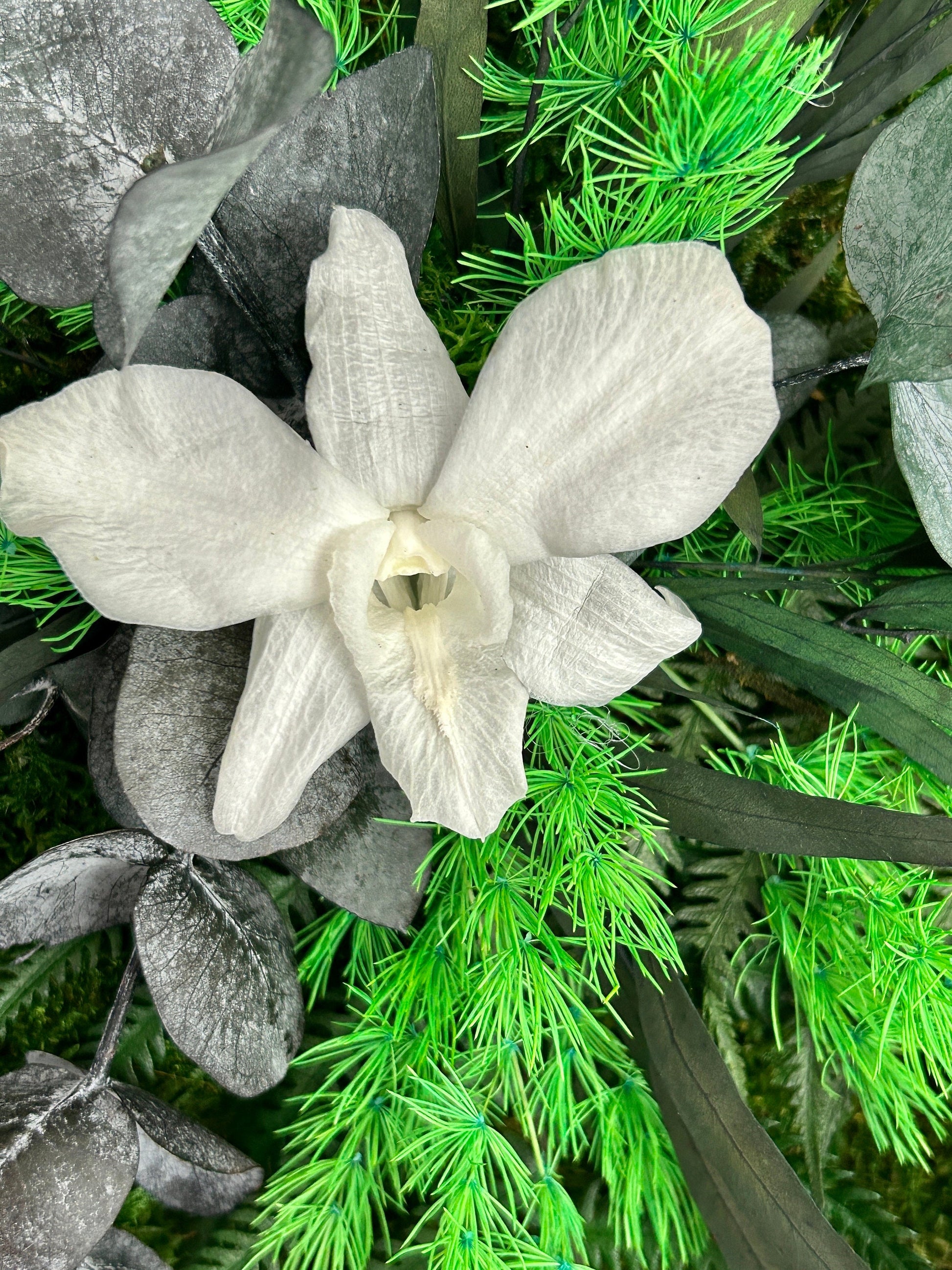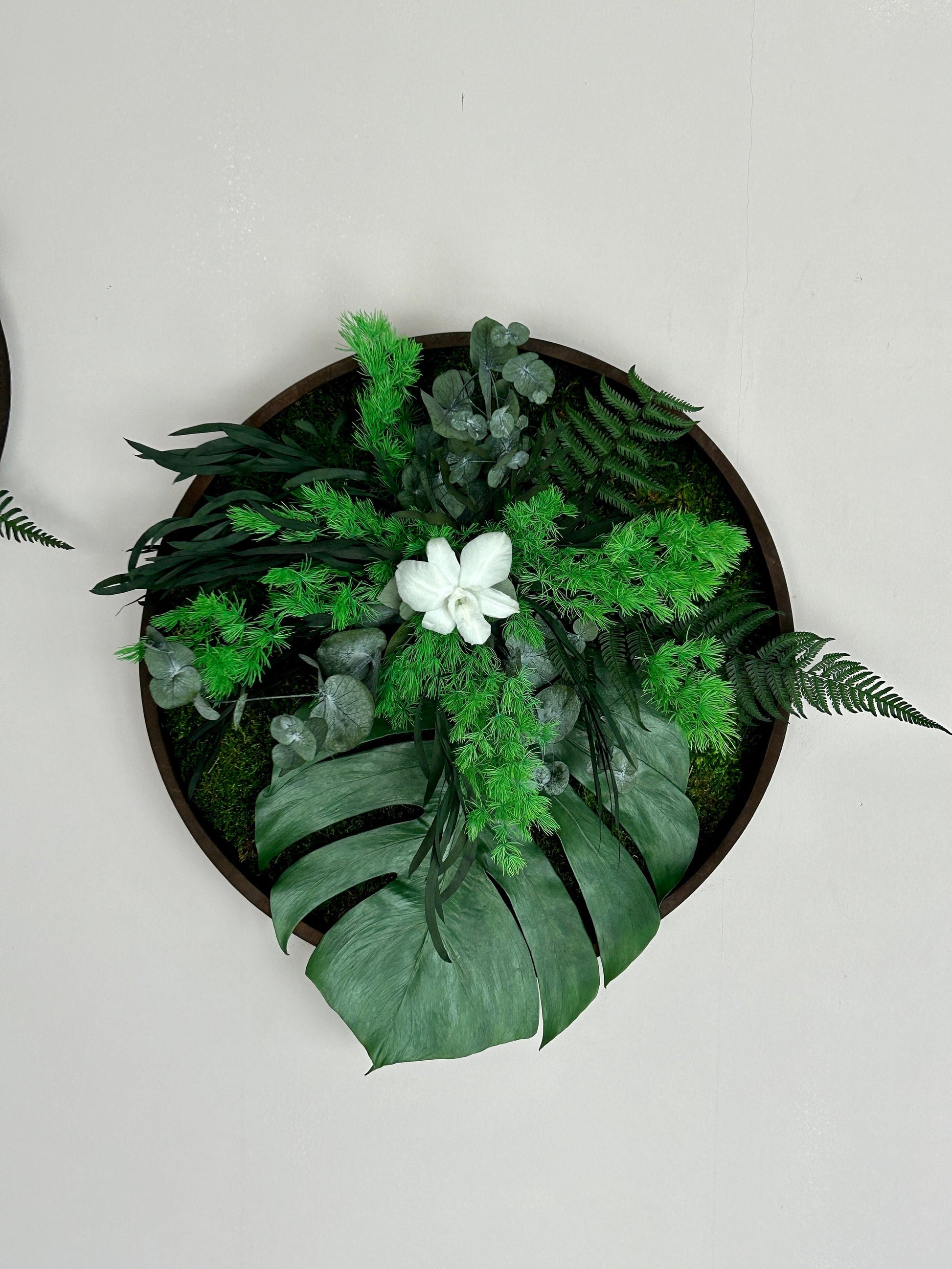 • Cadre 40 cm : enrichi d’une orchidée blanche et d’une feuille de monstera stabilisée.