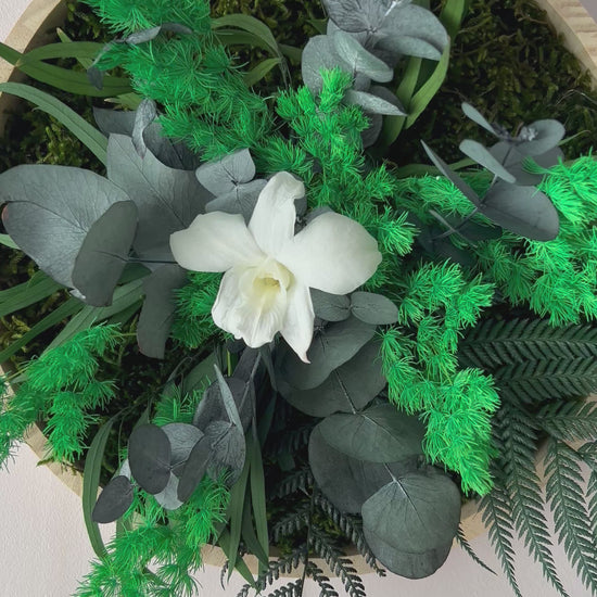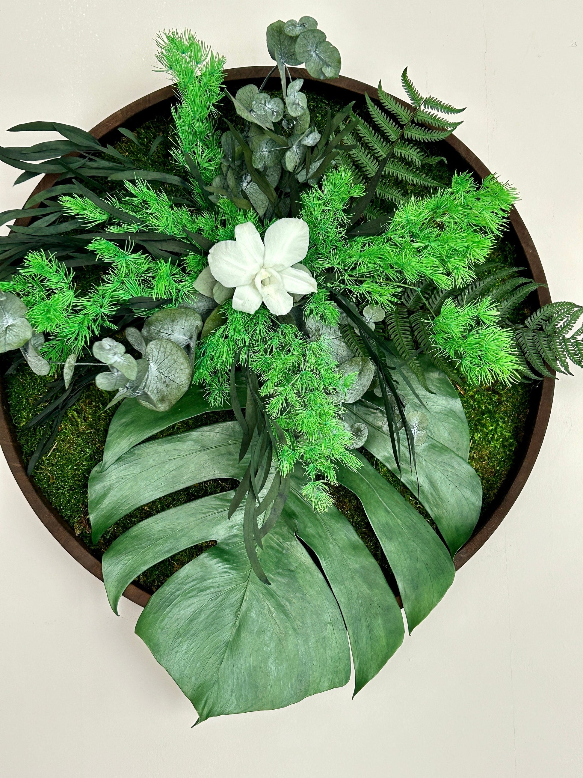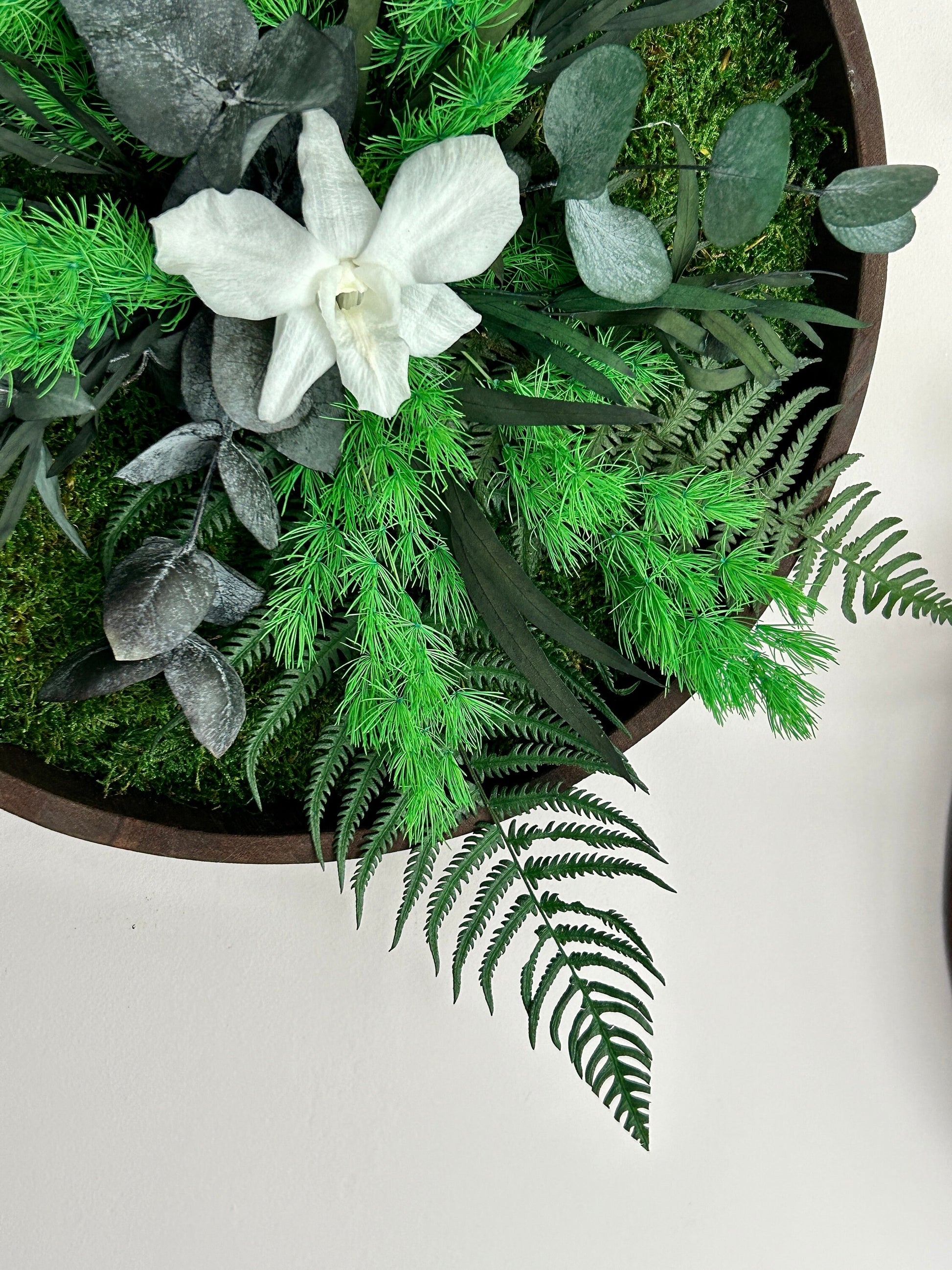 • Cadre 40 cm : enrichi d’une orchidée blanche et d’une feuille de monstera stabilisée.